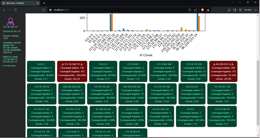 IP statisztikák (csomagvesztés, sávszél, SNR), grafikonok és összehasonlítások. Letisztult GUI, adatbázis alapú riportok.