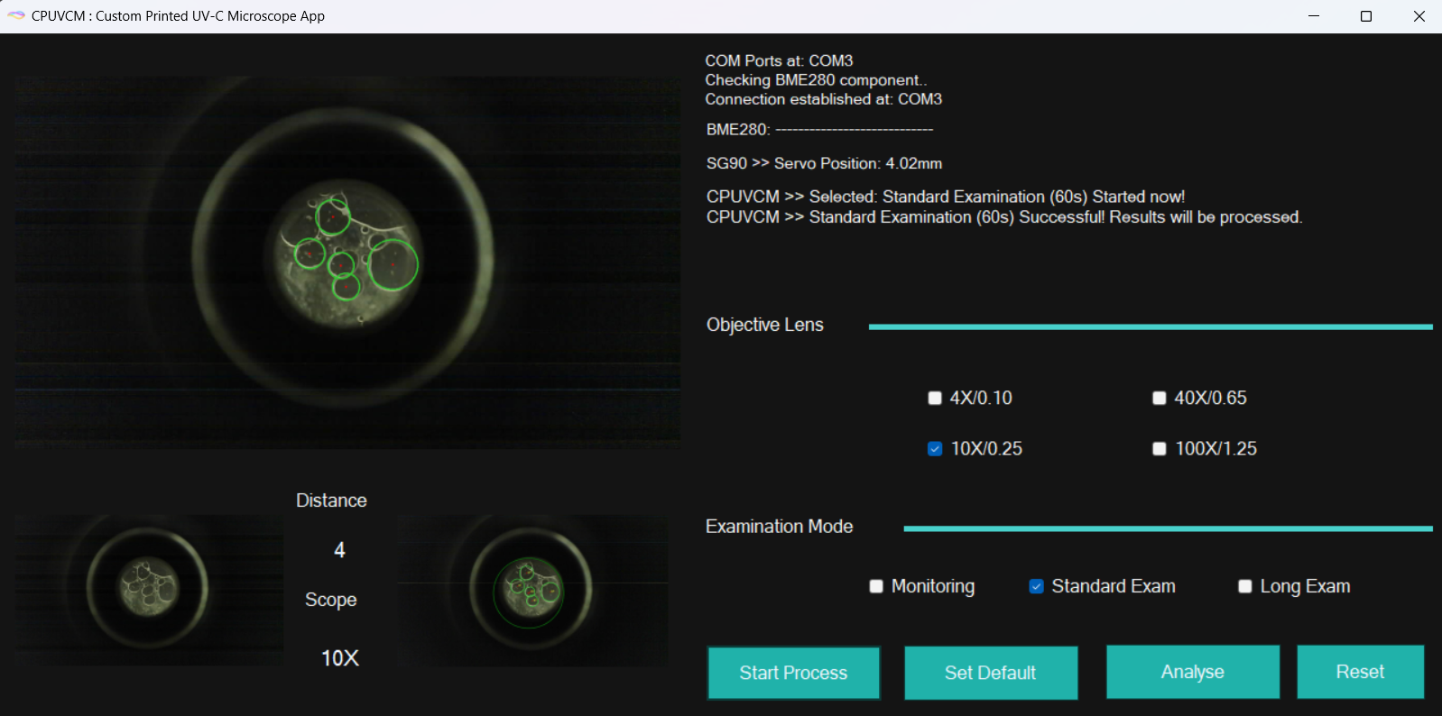 A CPUVCM egy mikroszkópos megfigyelőrendszer, ahol az ESP32-WROOM-32D és az ESP32-CAM biztosítja a képet, a teljes vezérlést pedig egy C# .NET alkalmazás végzi, miközben a kiértékelés PC-n történik (képfeldolgozás, exportok). A hardverben egy 10W COB LED adja a folyamatos megvilágítást, míg az 1W UV-C LED külön kapcsolható MOSFET-en és step-up tápon keresztül, kiegészítve környezeti szenzorokkal. A mechanikai részhez SG90 szervók és két mikro végálláskapcsoló tartozik az autofókuszhoz, biztonsági határolással fel/le korrekciókhoz. A szoftveres célok közé tartozik a valós idejű autofókusz (élességi metrika alapján) és az ID tracking, hogy a kolóniák/baktériumok ugyanazon példányai időben követhetők és összehasonlíthatók legyenek.