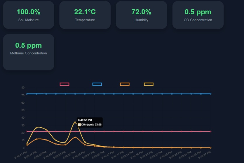 Kísérleti célú, valós idejű környezeti megfigyelőrendszert mutat be, amely beltéri növények állapotának nyomon követésére és a levegő minőségének figyelemmel kísérésére szolgál. A rendszer egy Arduino Uno R3 mikrokontrollerre épül, egy BME280, talajnedvesség-érzékelő, valamint MQ-9 és MQ-135 gázérzékelők felhasználásával. A rendszer képes rögzíteni a legfontosabb környezeti paramétereket, mint például a levegő minősége, illékony szerves vegyületek (VOC), szén-dioxid, hidrogén, cseppfolyósított petróleumgáz (LPG), ammónia, éghető gázok, metán, füst, hőmérséklet, páratartalom és légköri nyomás. A szenzoradatokat USB porton keresztül továbbítja egy Python-alapú Flask szervernek, amely feldolgozza azokat, és egy helyi webes API formájában szolgáltatja az információt. Egy HTML, CSS és JavaScript nyelven fejlesztett minimalista webes irányítópult (dashboard) lekéri az élő szenzoradatokat, és böngészőalapú felületen jeleníti meg azokat.