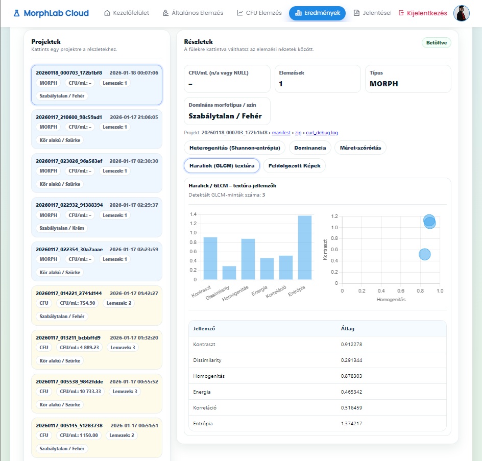 A MorphLab egy webes, oktatásra optimalizált kolóniaanalízis platform, amely nagyfelbontású képekből automatikus objektum/kolónia detektálást, méret- és morfológiai kiértékelést, valamint CFU-számítást ad áttekinthető riportban. A felület célja, hogy a petri-csésze képein a kolóniákat morfológiai szempontok alapján megjelölje és megszámolja, majd a megadott paraméterekkel CFU/mL jellegű számításokat és vizuális eredményeket (kijelölések, grafikonok, riportok) készítsen