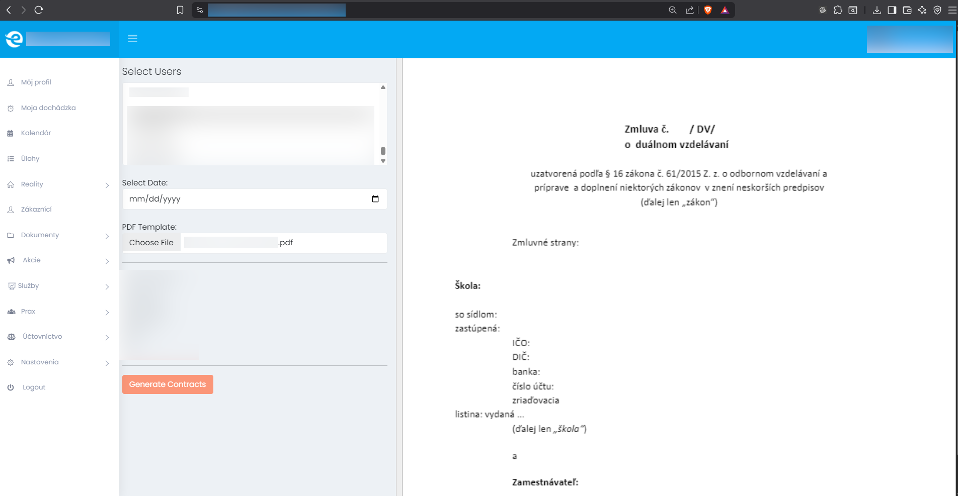 A rendszer célja, hogy vállalkozások számára a dokumentumok és szerződések előállítása ne manuális feladat legyen, hanem strukturáltan és automatizáltan, egységes sablonok alapján történjen. Ehhez olyan admin felületek készültek, amelyek az alkalmazotti nyilvántartást és a számlázási–fizetési folyamatokat is átláthatóan kezelik. A megbízható működés érdekében továbbfejlesztett jogosultság- és role menedzsment, adatbázis-optimalizálás és adattömörítés került bevezetésre a teljesítmény és a költséghatékonyság javítására. A háttérfolyamatok automatizálását ütemezett CRON-jobok és agentek biztosítják, amelyek különböző munkamenetekben futtatják a szükséges feladatokat.